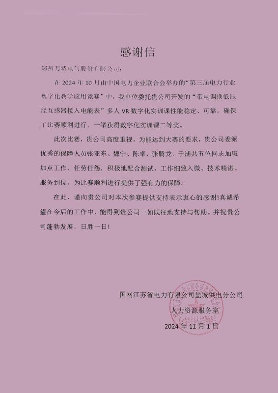 2024年11月1日,公司收到了來自國網(wǎng)江蘇省電力有限公司鹽城供電分公司的感謝信,對公司在“第三屆電力行業(yè)數(shù)字化教學(xué)應(yīng)用競賽”中的卓越貢獻表示高度贊揚和衷心感謝。