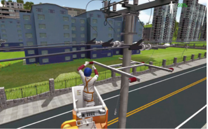 配網(wǎng)帶電作業(yè)VR 實(shí)訓(xùn)系統(tǒng)采用VR 多人互動(dòng)技術(shù)和仿真絕緣斗臂車平臺(tái)相結(jié)合的方式,為參訓(xùn)人員提供沉浸式 的作業(yè)環(huán)境。培訓(xùn)人員按各自崗位在虛擬環(huán)境中,扮演不同的作業(yè)人員模擬開(kāi)展帶電作業(yè),真實(shí)感受作業(yè)工 況和操作職責(zé),在違章時(shí)通過(guò)畫(huà)面、聲音、文字、觸覺(jué)感知等形式給予實(shí)時(shí)的反饋與警示,系統(tǒng)在確保人身 安全的前提下進(jìn)行高仿真的虛擬培訓(xùn),能夠有效提升學(xué)員的應(yīng)變能力和實(shí)操技能。