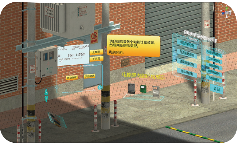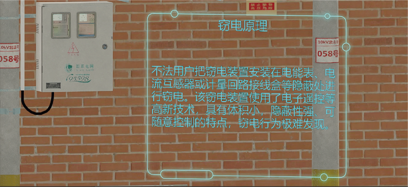 該系統(tǒng)應用虛擬現(xiàn)實技術搭建由計量箱、電能表和測試儀器等設備組成的三維反竊電環(huán)境,使培訓人員置身 于計量裝置運行的真實環(huán)境中,并能夠進行操作與體驗。通過視覺、聽覺、觸覺的方式,讓培訓人員通過各 種交互方式在虛擬環(huán)境中掌握反竊電方法。